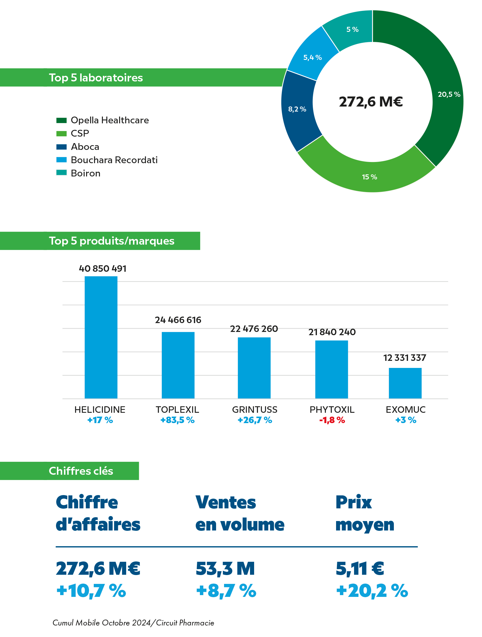 Les trois principaux laboratoires qui dominent le marché sont Opella Healthcare, CSP et Aboca : ces laboratoires ont su capitaliser sur l’augmentation de la demande, avec des taux de croissance impressionnants, particulièrement pour Opella Healthcare et Aboca.
