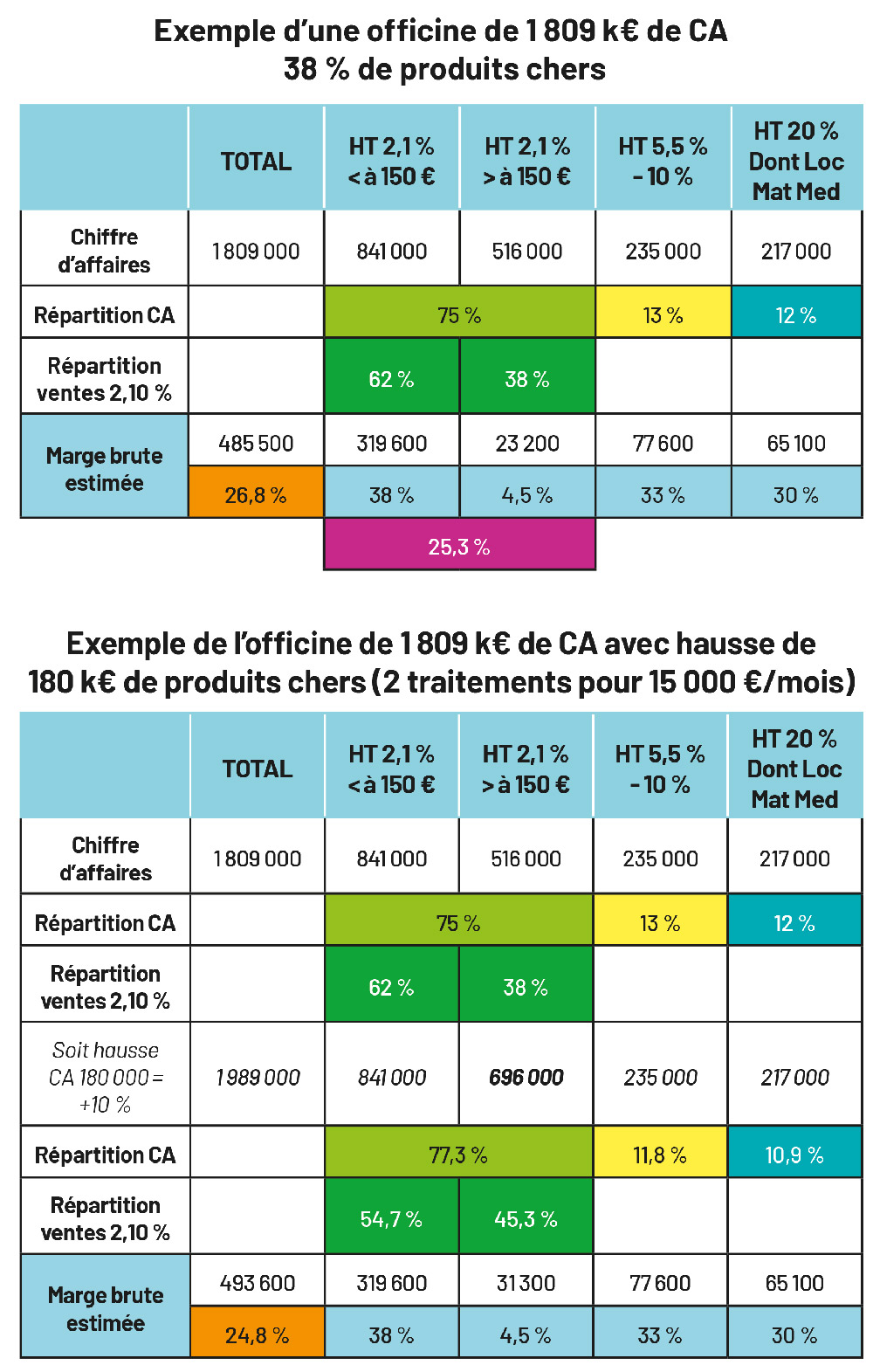 On peut considérer qu’actuellement, les médicaments chers représentent désormais entre 38 % et 40 % du CA HT médicaments. Il apparaît donc cohérent d’exclure du CA de référence, la partie supérieure à cette moyenne de 40 %.