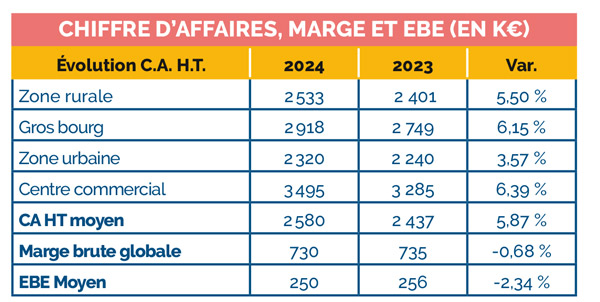 L’année 2024 marque la fin de l’effet « rattrapage » post-Covid et une normalisation de l’activité officinale. Le CA HT moyen atteint 2 580 k€, en hausse de 5,9 % vs 2023.