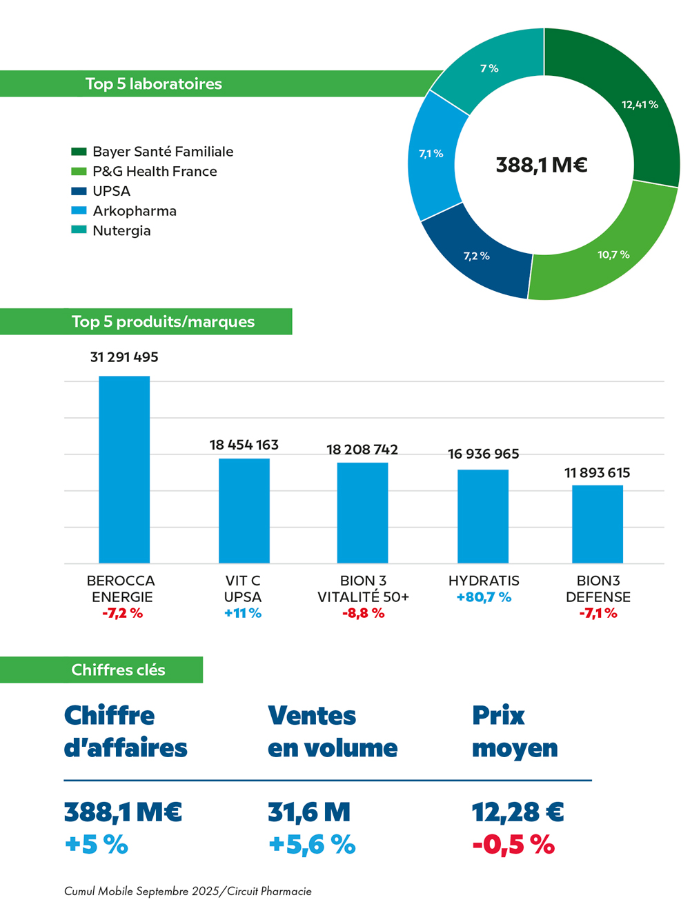 • UPSA (+11,6 %) et Nutergia (+5,4 %) sont les seuls du top 5 à progresser, portés par le dynamisme de la vitamine C et de la micronutrition.