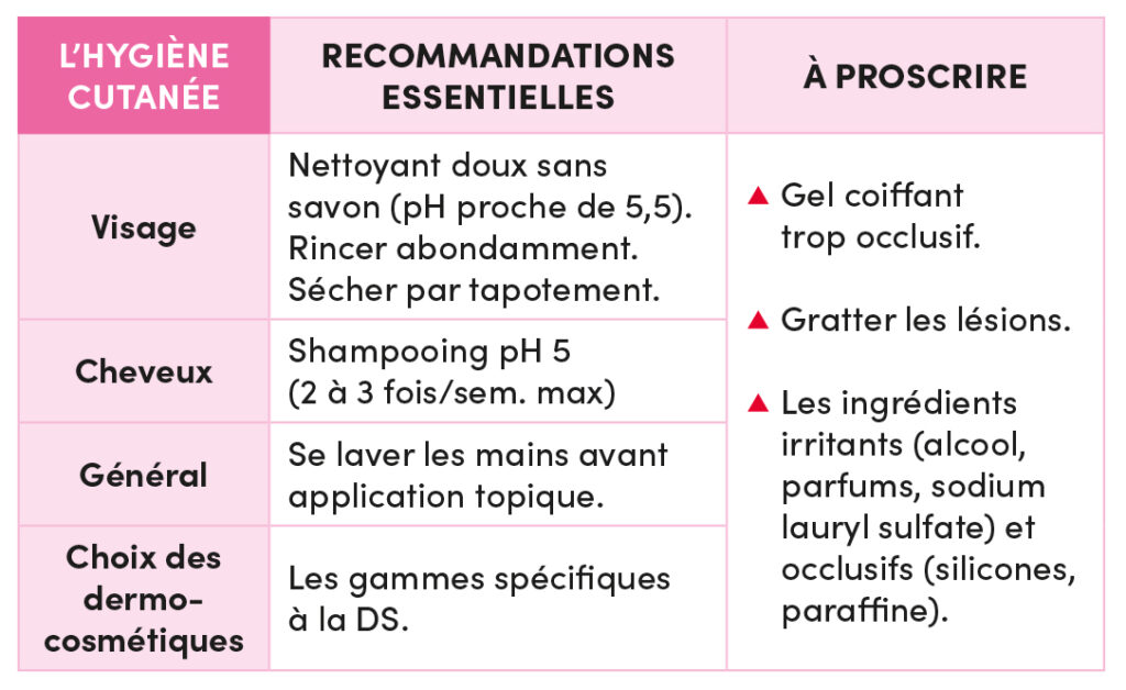 La prise en charge thérapeutique actuelle de la DS ne conduit pas à une guérison complète, mais permet une rémission prolongée et améliore le confort du patient. Au-delà des thérapies, le rôle des équipes officinales est de délivrer un programme d’accompagnement, de soins de support et d’entretien (pendant et en dehors des crises) fondé sur des règles d’hygiène de vie et des soins dermocosmétiques ciblés.