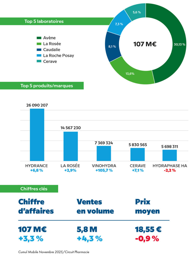 • Avene reste leader en valeur (32,2 M€, 30,1 % de parts de marché), avec une croissance supérieure à celle du marché (+5,6 %).
