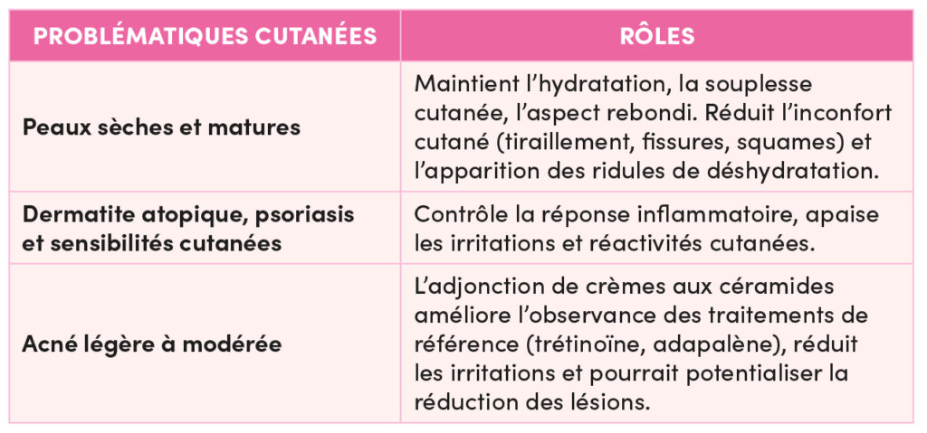 La quantité de céramides cutanés diminue sous l’effet de l’âge, des saisons froides ou de la ménopause. Un déséquilibre de ces molécules compromet l’efficacité de la barrière lipidique et est associé à des pathologies comme la dermatite atopique, la dermatite séborrhéique, le psoriasis ou l’acné. Cette altération induit une déshydratation, une sécheresse, une sensibilité accrue et une accélération des signes de vieillissement.