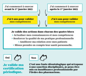 Alors que la certification est entrée en vigueur en 2023 et que les textes ont tardé à paraître, le compte à rebours est donc lancé pour les pharmaciens qui doivent valider leurs actions sous 3 à 6 ans.