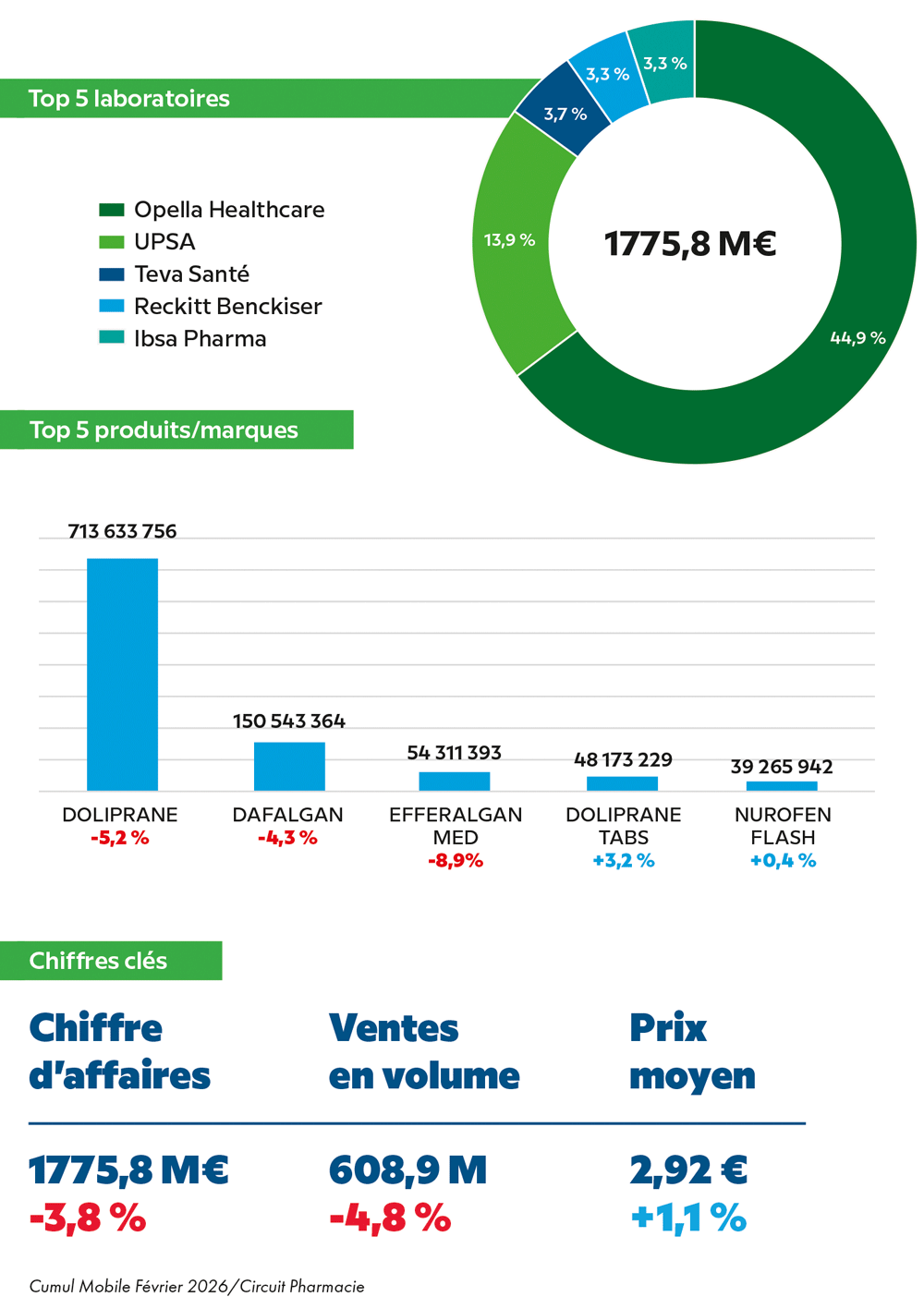 Le marché français des antalgiques en pharmacie pèse 1,776 milliard d’euros au cumul mobile annuel (CMA) de février 2026. Il recule toutefois de 3,8 % en valeur et de 4,8 % en volume, à 608,9 millions d’unités vendues, tandis que le prix moyen atteint 2,92 €, en hausse de 1,1 %.