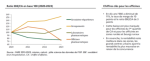 Aussi, sur les 10 dernières années, le rapport pointe une baisse de 11 points de l’excédent brut d’exploitation (EBE) et de 10 points du taux de marge pour l’officine. Une dégringolade d’autant plus marquée à partir de 2022, quand, en parallèle, l’industrie pharmaceutique retrouve des couleurs.