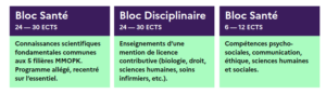 – 1 bloc santé (6 à 12 ECTS) : réunissant les compétences psychosociales, éthiques, de communication et des sciences humaines et sociales.